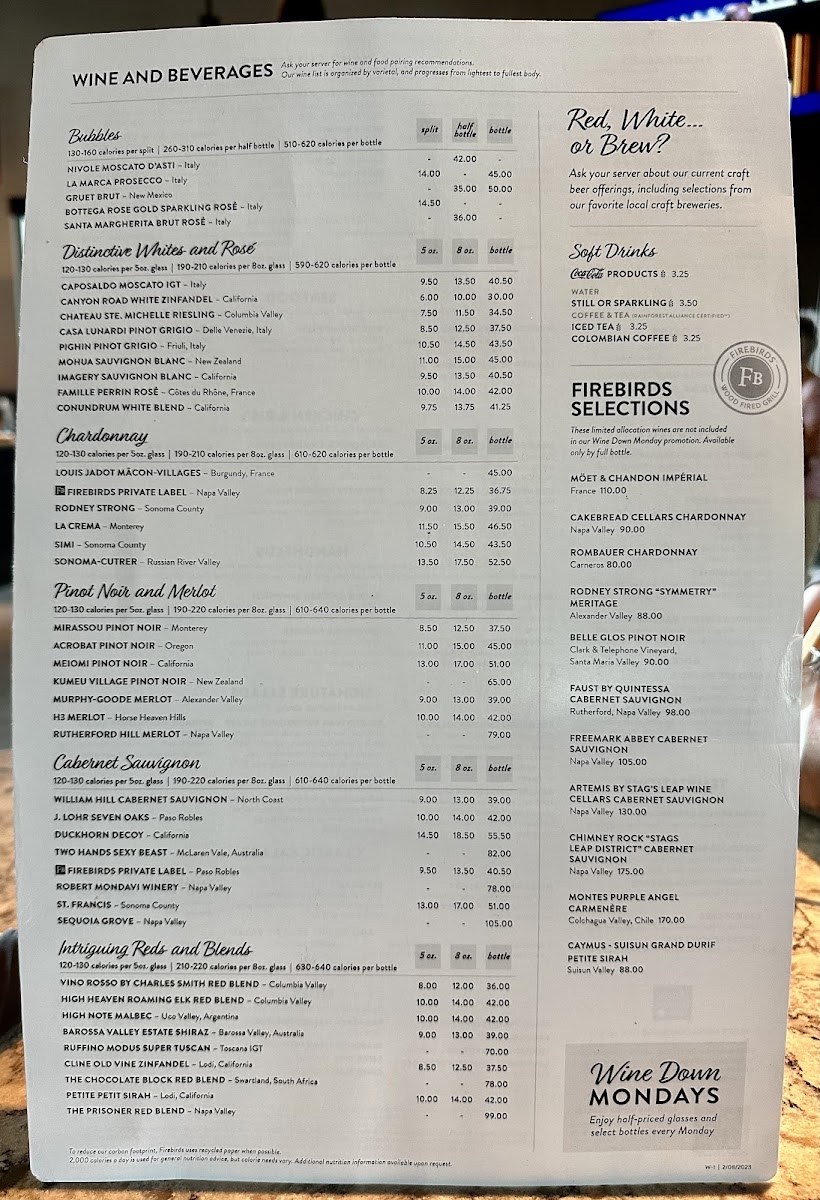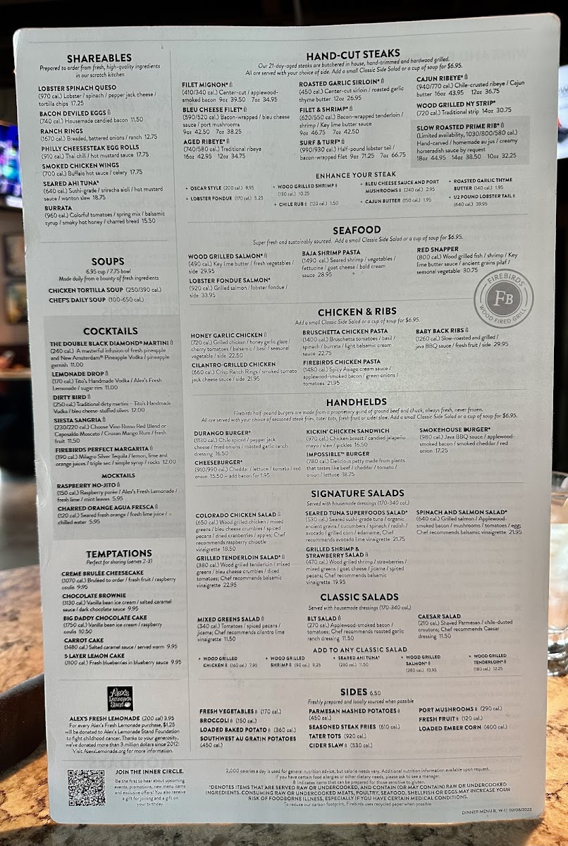 Introducing the menu at Firebirds Wood Fired Grill - Frederick, you can expect a delightful blend of flavor and skillful preparation. Located at 5201 Buckeystown Pike, Frederick, MD, this wood-fired grill specializes in a variety of mouthwatering options. Start with their smoked wings, available in plain or saucy buffalo, paired with refreshing celery and your choice of blue cheese or homemade ranch for just US$14.50. If you're craving a burger, don’t miss the Wood Grilled CheddarBurger or the Whiskey BBQ BaconBurger, both bursting with flavor and perfectly grilled on a toasted brioche bun. Complement your meal with crispy seasoned steak fries or tater tots, each priced at US$4.95. This restaurant promises outstanding service—guests rave about the friendly staff and the warm, inviting atmosphere, making it a must-visit destination for delicious grilled fare.